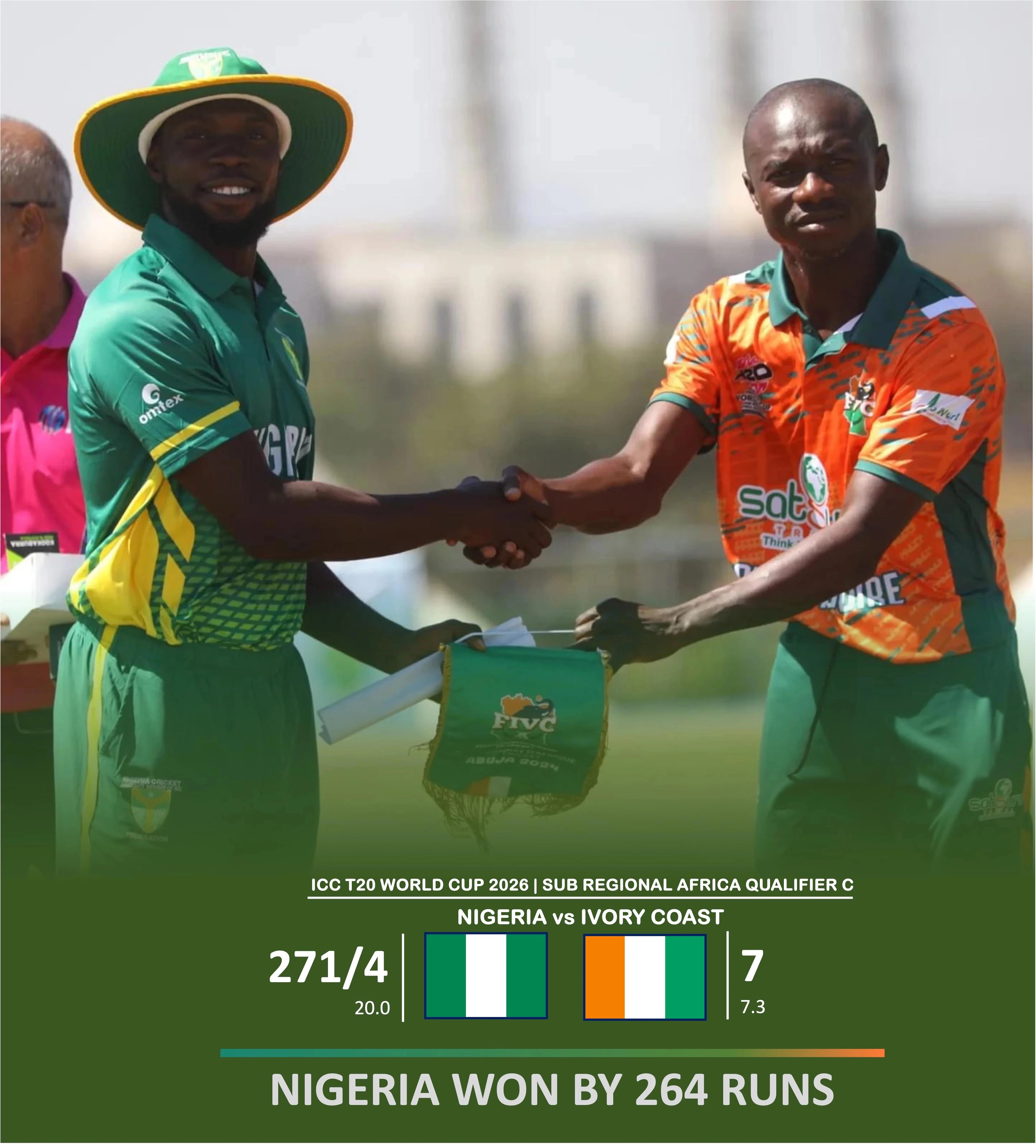 نائیجریا کی ٹیم آئیوری کوسٹ کو 264 رنز سے شکست دیکر بڑے مارجن سے ٹی 20 انٹرنیشنل میچ جیتنے والی تیسری ٹیم بھی بن گئی ہے۔